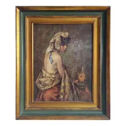 Hand-Painted Oil on Canvas 30x40 cm Woman with Lantern Made in Italy