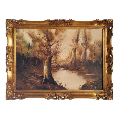 A painting of material realism with expressionist influences, using impasto technique, with dense, visible, and vigorous brushstrokes (especially in the tree trunks and water) to convey texture and dynamism. A splendid landscape painting created with oil on canvas technique, a work that recalls the typical expressionist style of the early 20th century. This painting is ideal for those looking for a refined and timeless decorative element. The dimensions of 50x70 cm make it perfect for enhancing important walls, bringing elegance and depth to any environment, from the living room to the professional studio. A work carefully crafted in the smallest decorative details to ensure a superior visual impact. Perfect as a prestigious gift idea or for art collectors.